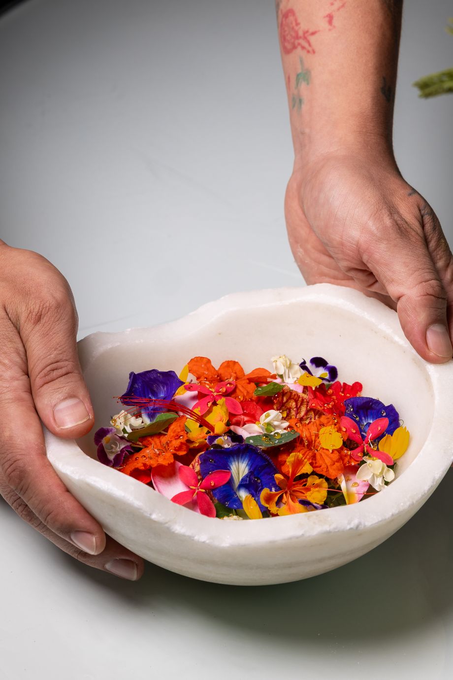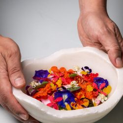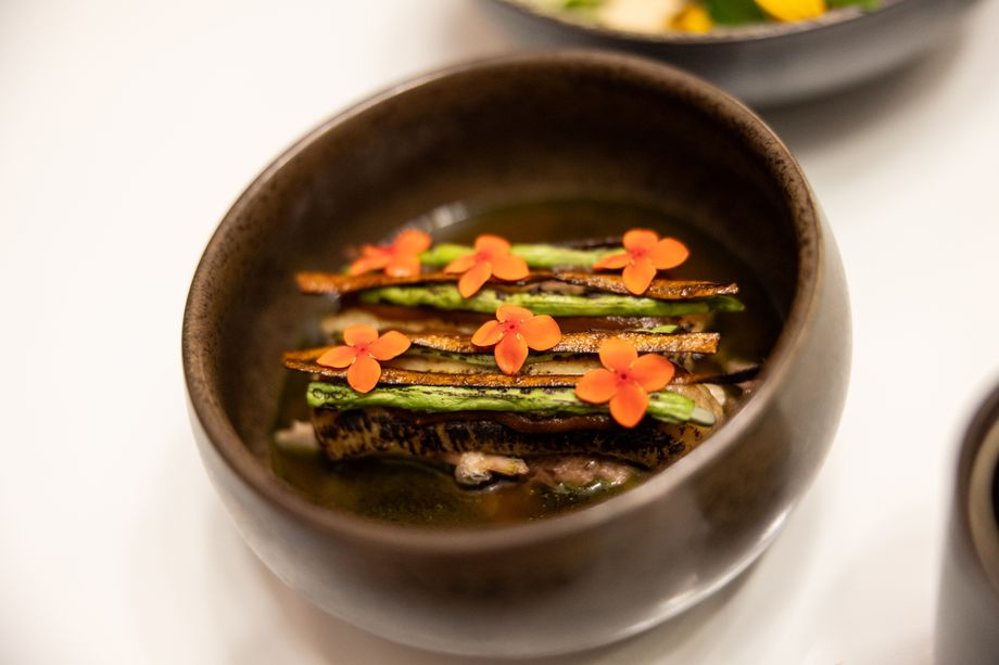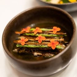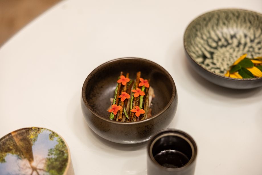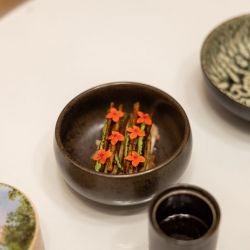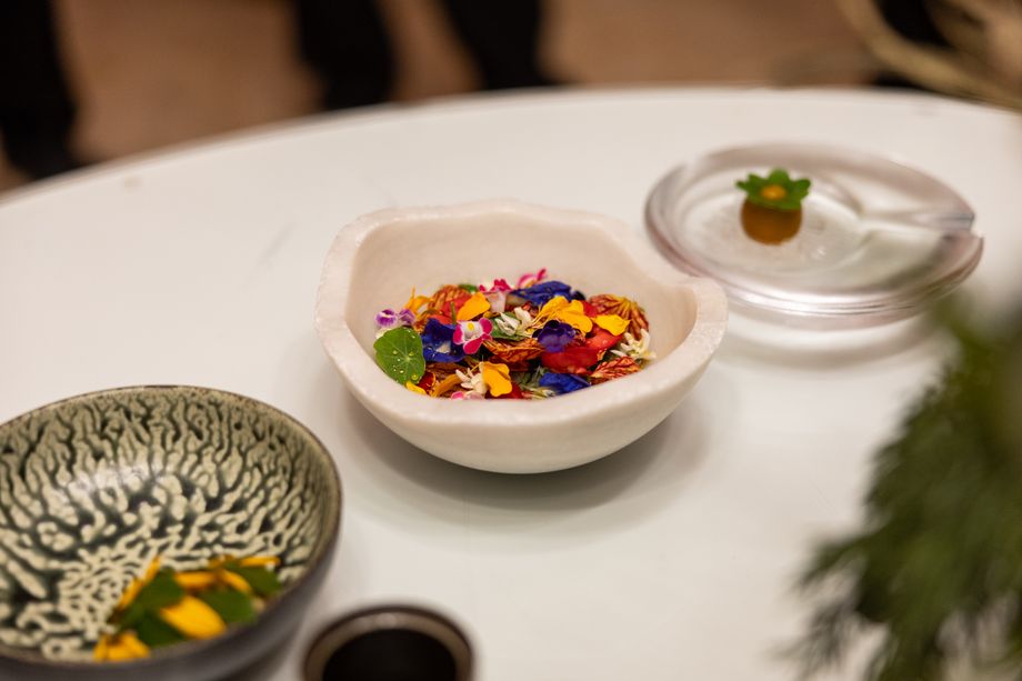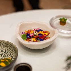 The second act, the Caribbean Flower Salad, celebrated tropical freshness through pickled cashew fruit, nut cream, and a delicate array of flowers and greens, accompanied by the Alsatian wine Complantation by Marcel Deiss.
